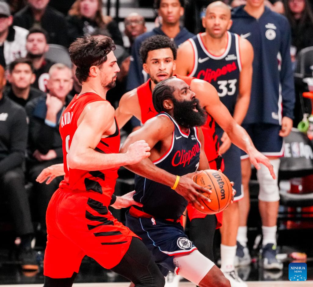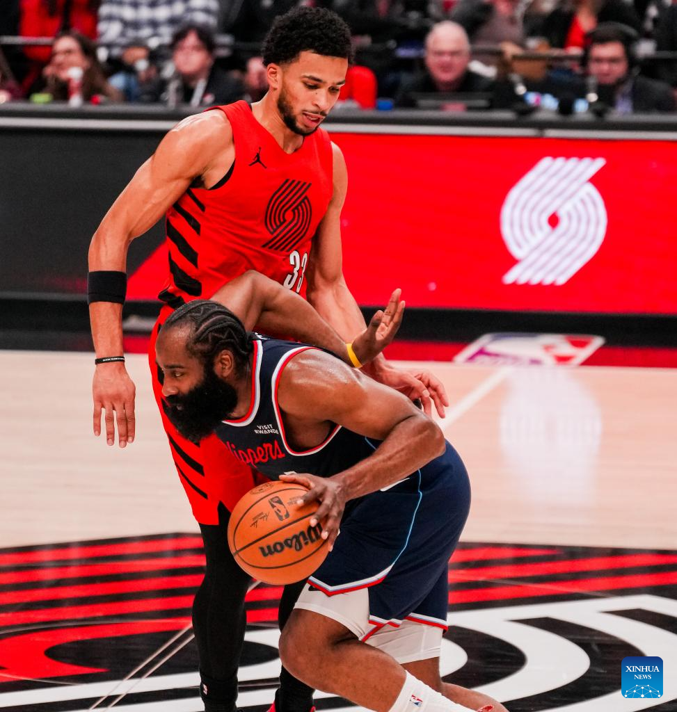 Deni Avdija (C) of Portland Trail Blazers breaks through past James Harden (R) of Los Angeles Clippers during the 2025-2026 NBA regular season match between Portland Trail Blazers and Los Angeles Clippers in Portland, the United States, Dec. 26, 2025. (Photo by Sun Yuxuan/Xinhua)