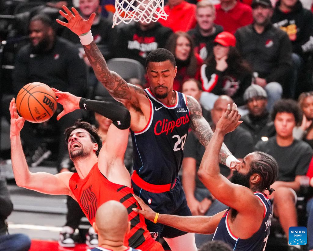 John Collins (top) of Los Angeles Clippers defends Deni Avdija (L) of Portland Trail Blazers during the 2025-2026 NBA regular season match between Portland Trail Blazers and Los Angeles Clippers in Portland, the United States, Dec. 26, 2025. (Photo by Sun Yuxuan/Xinhua)