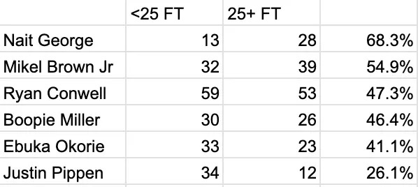 Off-the-dribble jump shots for non-elite shooters are winning possessions for the defense. Especially with how far beyond the arc George often attempts them from. Looking at the rest of the top six highest-volume off-the-dribble three-point shooters in the ACC, George attempts a significantly higher share of his threes from more than 25 feet.
