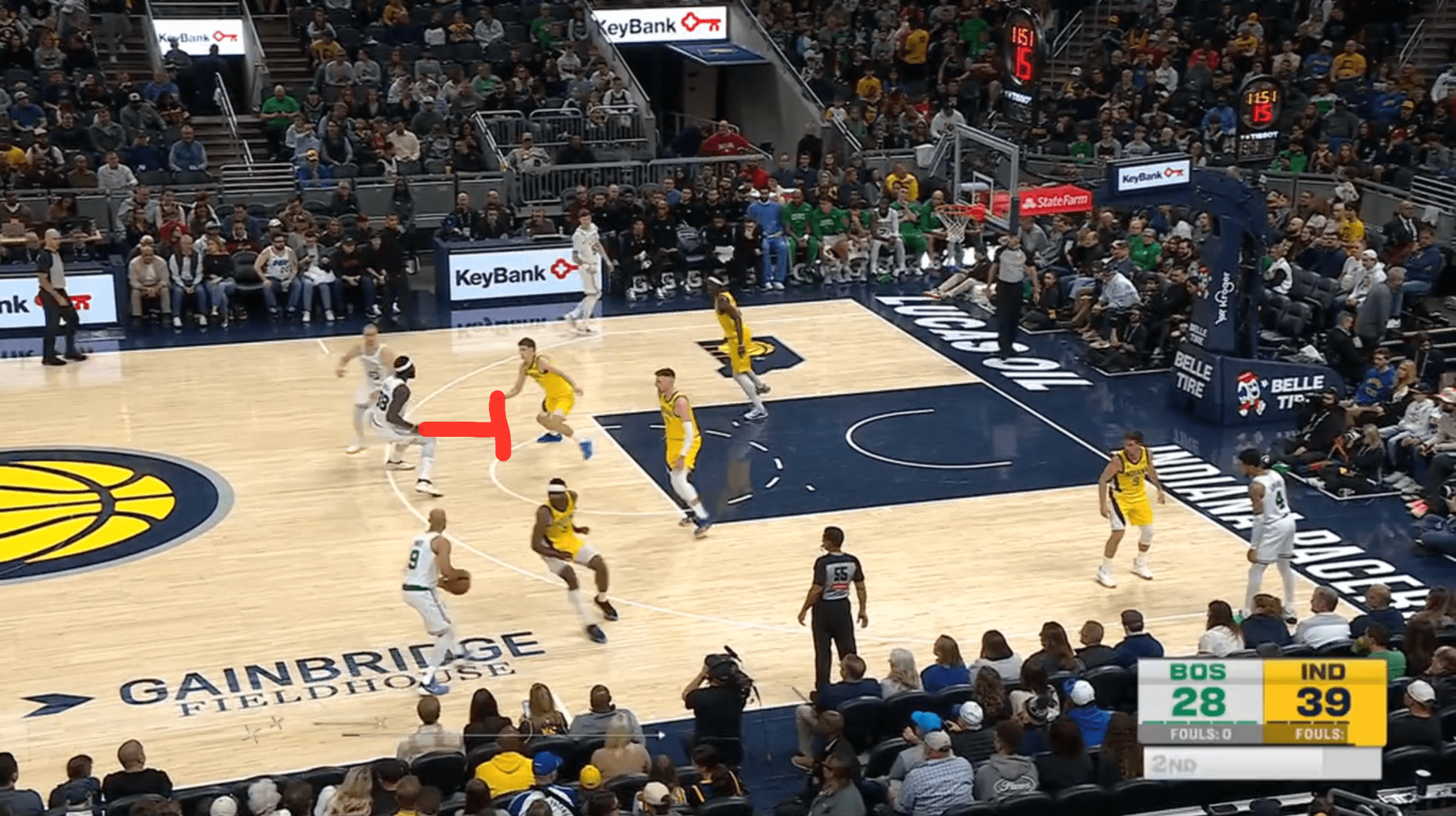 Ball finds Brown at the top of the key and that switch he got earlier pays dividends. Pacers take no chances and double Brown as soon as he dribbles. He kicks out and the right passes are made for a score.