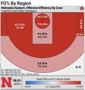 Speaking of Big Ten offenses that could give the Terrapins difficulty, here comes Nebraska. The Cornhuskers are the country’s best 2-point shooting team, making 61.3 percent of their field-goal attempts inside the arc. They are particularly deadly inside the charge circle, converting 73.4 percent of those attempts. That’s like a full team of Audi Crookses. And it’s not as if Nebraska doesn’t get to the rim frequently. The Cornhuskers take 36.1 percent of their field goals in the restricted area. If defenses force them outside of the paint, they’re fantastic from the midrange, making 52.3 percent of those jumpers, more than 20 percent better than the national average. With Britt Prince, Amiah Hargrove and Petra Bozan each making at least 60 percent of their 2s, Nebraska poses a myriad of defensive challenges.