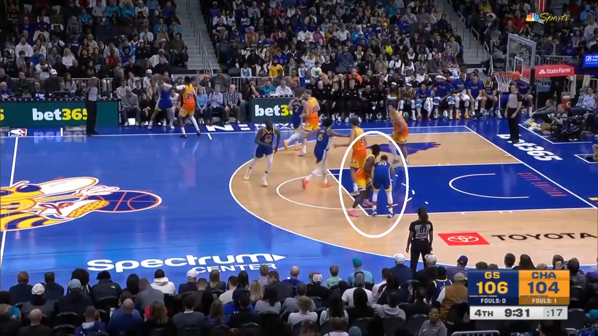 Curry sets a rock-solid flat-angle screen on PJ Hall that clears the lane for Green — nullified due to being called for a questionable offensive foul, given that Curry was largely stationary in his attempt to set a screen. Regardless, it informed the approach the Warriors had when it came to unshackling Curry from the Hornets’ copious top-locking and physicality.