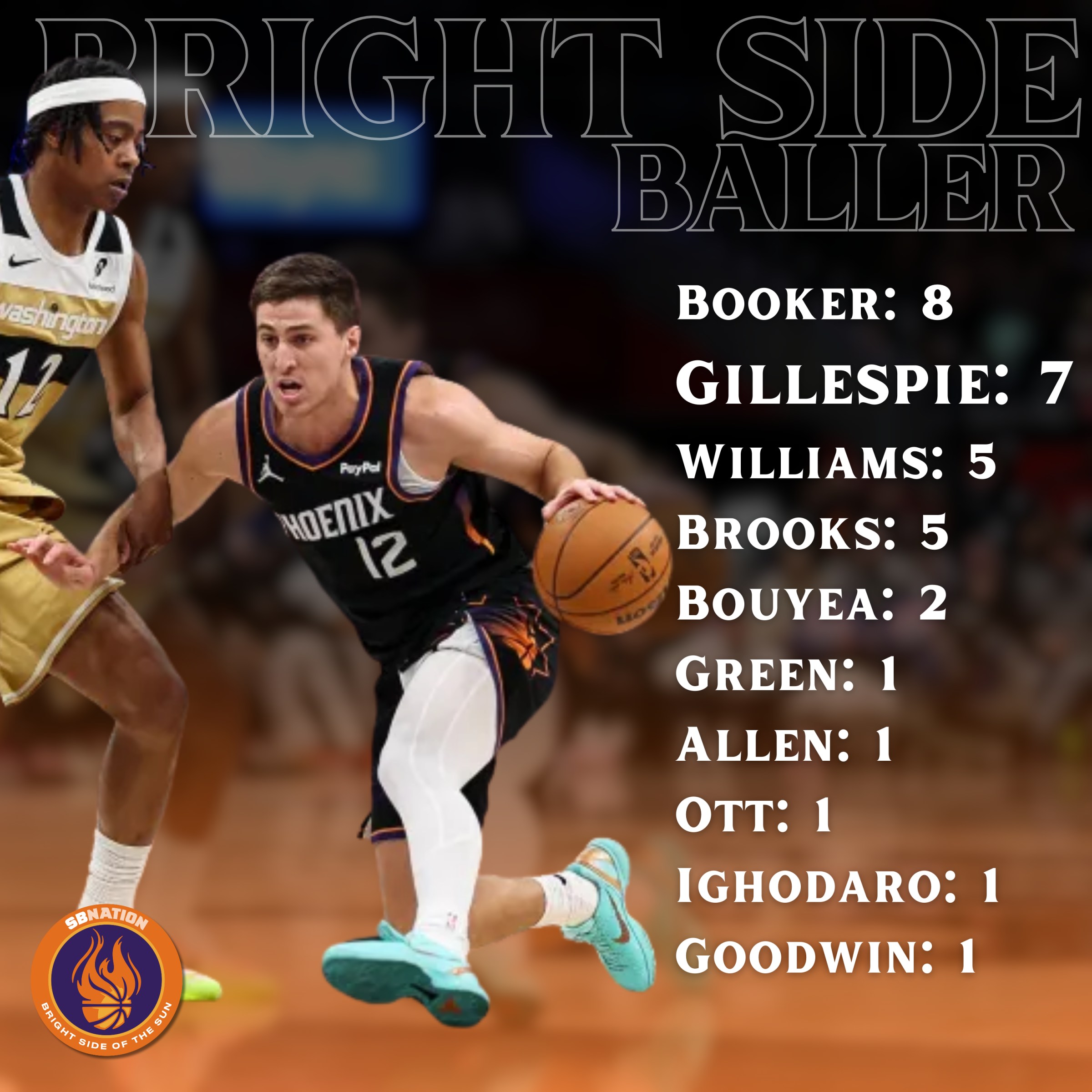 He continues to be the engine behind this team’s unexpected rise. After pulling in 71% of the Bright Side Baller vote, Gillespie now sits at seven on the season, one shy of the leader, Devin Booker. The gap is closing, and it feels earned.