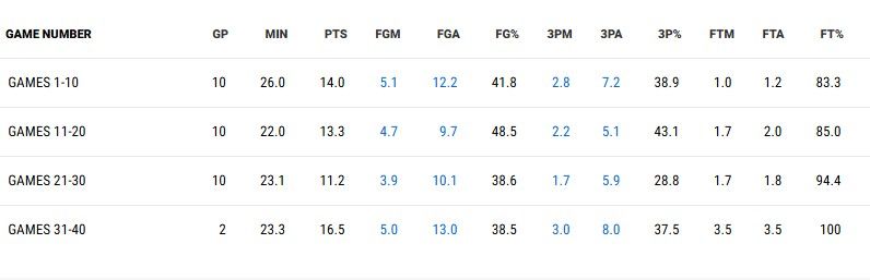 Whatever work Brown has put in this past summer has paid off in a big way. He’s been itching for this role and he’s thriving in it. His scoring is way up, but not by sacrificing other parts of his game. His assist percentage is 4.4% higher than last year’s career-high of 21.4%. His usage rate is up more than 7% but his turnover rate is only up 1.4% and his total turnovers are in line with other high-usage stars like Jokic, Cade Cunningham (side note: SGA at 1.9 turnovers per game might be the most amazing stat out there). His rebounding and block percentages are up and his steal percentages are level.