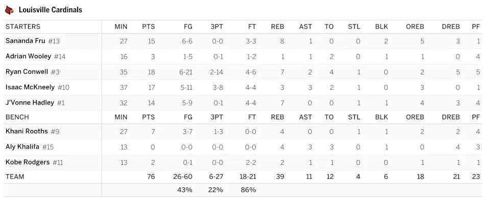 Louisville trailed for nearly the entirety of the game, struggling from behind the arc (6-of-27) and allowing Stanford to shoot 47% from three and 46% from the field overall.