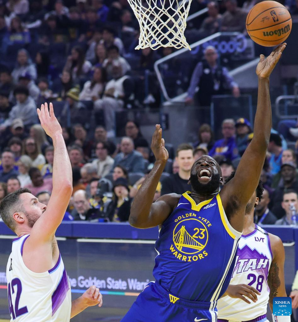 Draymond Green (front R) of Golden State Warriors goes for a layup during the 2025-2026 NBA regular season basketball match between Golden State Warriors and Utah Jazz in San Francisco, the United States, Jan. 3, 2026. (Photo by Dong Xudong/Xinhua)