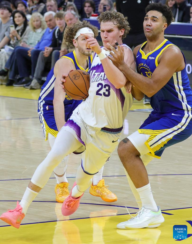 Lauri Markkanen (L) of Utah Jazz competes during the 2025-2026 NBA regular season basketball match between Golden State Warriors and Utah Jazz in San Francisco, the United States, Jan. 3, 2026. (Photo by Dong Xudong/Xinhua)