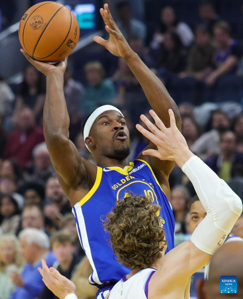Jimmy Butler (top) of Golden State Warriors shoots during the 2025-2026 NBA regular season basketball match between Golden State Warriors and Utah Jazz in San Francisco, the United States, Jan. 3, 2026. (Photo by Dong Xudong/Xinhua)