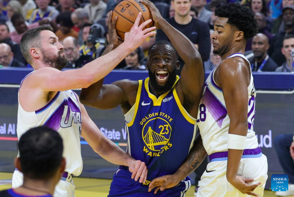 Draymond Green (C) of Golden State Warriors competes during the 2025-2026 NBA regular season basketball match between Golden State Warriors and Utah Jazz in San Francisco, the United States, Jan. 3, 2026. (Photo by Dong Xudong/Xinhua)