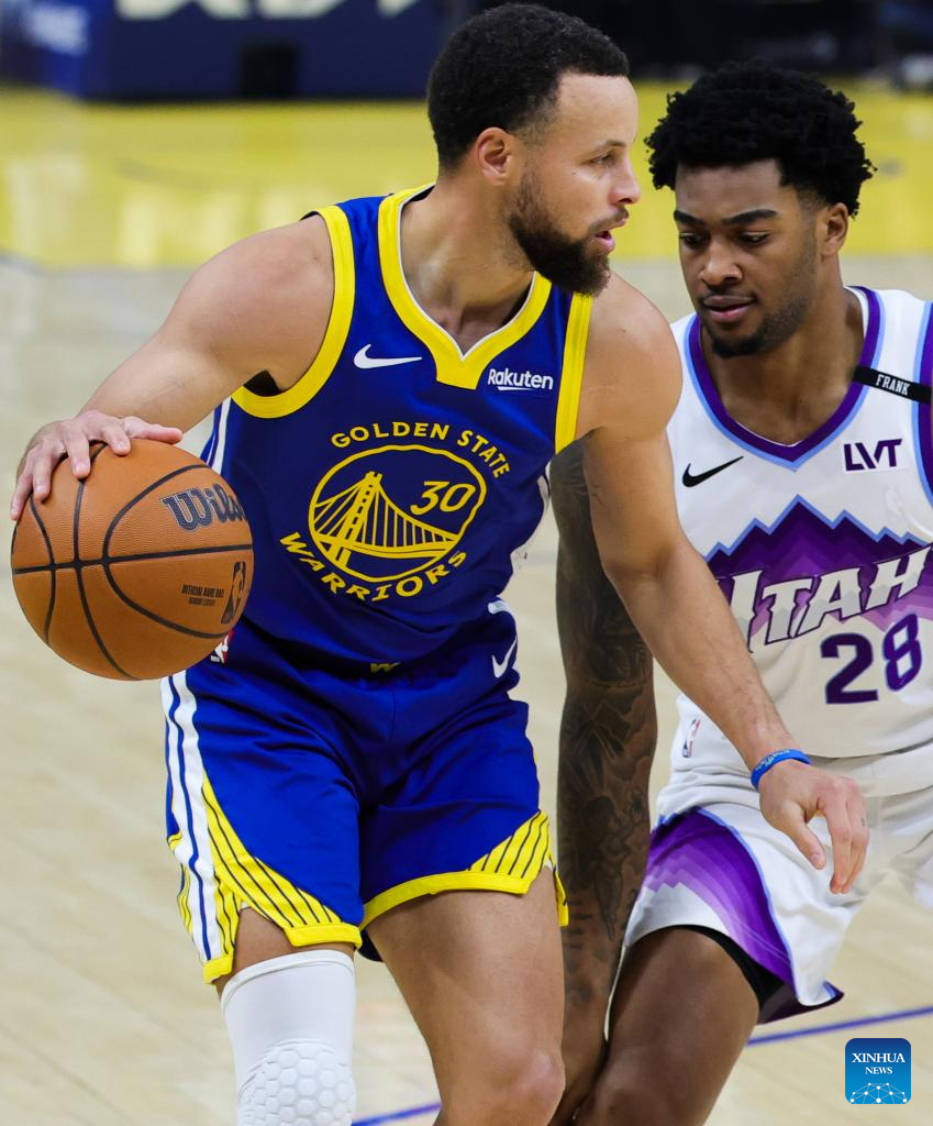 Stephen Curry (L) of Golden State Warriors competes during the 2025-2026 NBA regular season basketball match between Golden State Warriors and Utah Jazz in San Francisco, the United States, Jan. 3, 2026. (Photo by Dong Xudong/Xinhua)