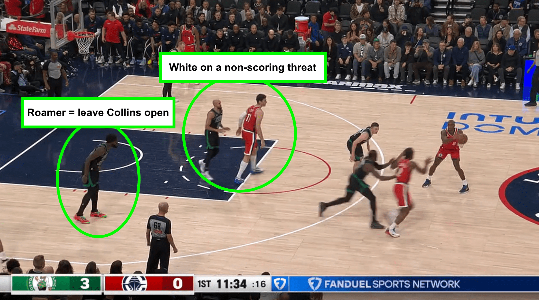 Meanwhile, Neemias Queta roamed near the rim. The Celtics treated John Collins as a non-shooting threat — a classic move from Joe Mazzulla’s coaching staff.