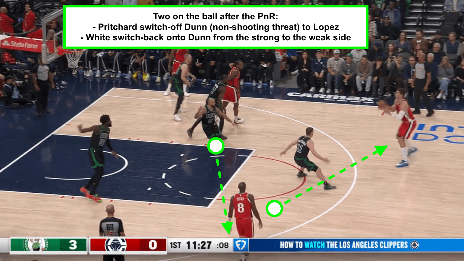 White handled the ball while the Celtics set two screens: one by Queta to involve Lopez and his drop coverage, and one by Pritchard to add confusion.