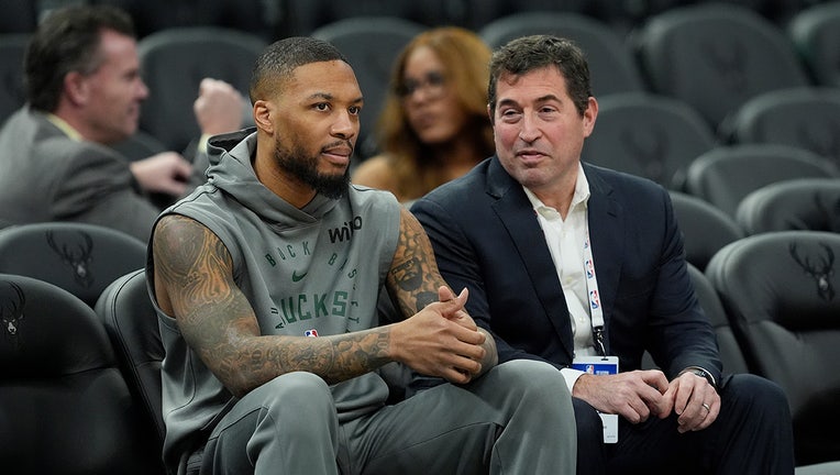 Peter Feigin, president of the Milwaukee Bucks, talks with Damian Lillard #0 (L) before a game against the San Antonio Spurs at Fiserv Forum on January 08, 2025 in Milwaukee, Wisconsin.