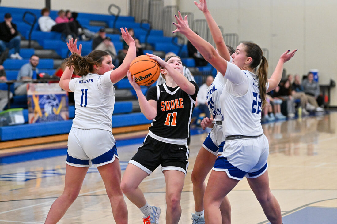 Jersey Shore’s Marlee Lehman (11) takes a shot as multiple Central Mountain defenders surround her during a girls basketball game on Tuesday Jan. 6, 2025, at Central Mountain. The Bulldogs won 59-49.