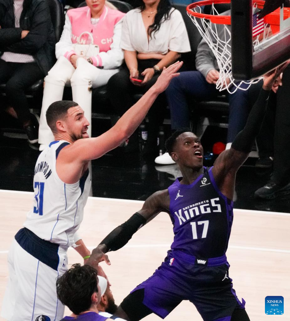 Dennis Schroder (R) of Sacramento Kings goes up for a layup during the 2025-2026 NBA regular season basketball match between Dallas Mavericks and Sacramento Kings in Sacramento, the United States, Jan. 6, 2026. (Photo by Sun Yuxuan/Xinhua)
