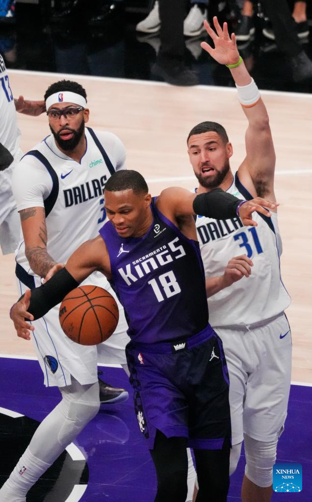 Russell Westbrook (C) of Sacramento Kings competes during the 2025-2026 NBA regular season basketball match between Dallas Mavericks and Sacramento Kings in Sacramento, the United States, Jan. 6, 2026. (Photo by Sun Yuxuan/Xinhua)
