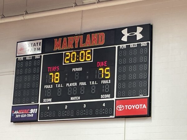 The scoreboard at the practice court in XFINITY Center in College Park, Maryland, displays the final score of the 2006 championship game in Boston. (WTOP/Joe Yasharoff)