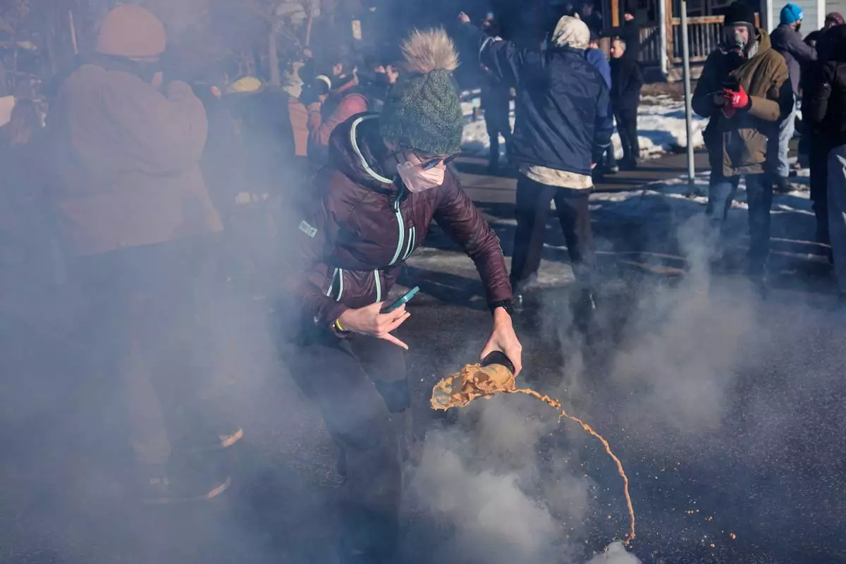 A protester grabs a tear gas grenade deployed by federal immigration officers near the scene where Renee Good was fatally shot by an ICE officer last week, Tuesday, Jan. 13, 2026, in Minneapolis. (AP Photo/John Locher)