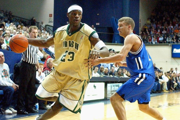 LeBron James when he was a high school senior playing basketball at the James A. Rhodes Arena in Akron, Ohio, on February 14, 2003. James signed his first NBA contract with the Cleveland Cavaliers that same year. Photo by Tom Cammett/UPI | License Photo
