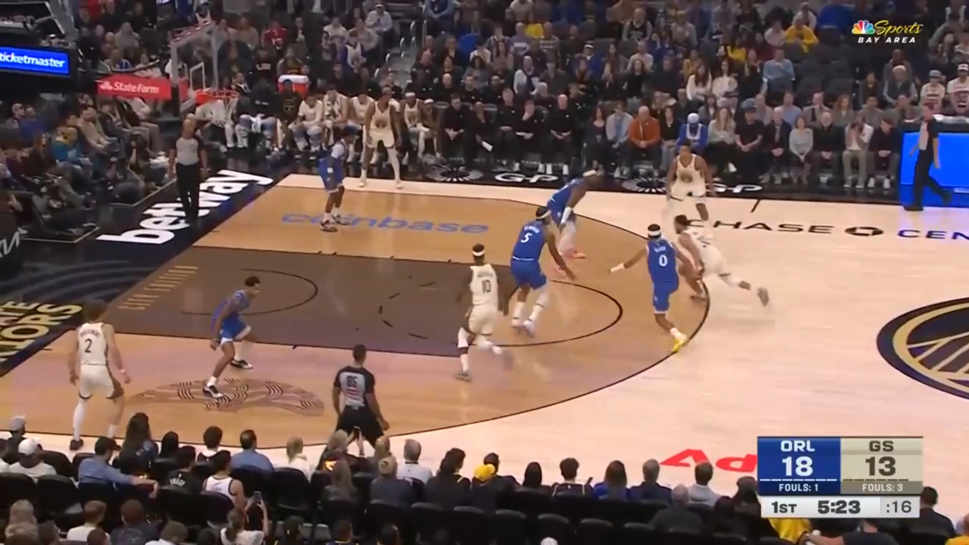 With Butler “ghosting” the screen and slipping toward the rim, Anthony Black is able to maintain contact with Curry around the screen, allowing Paolo Banchero to calmly contain Curry’s drive. As a result, the Magic defense is allowed to stay home without the need to rotate: