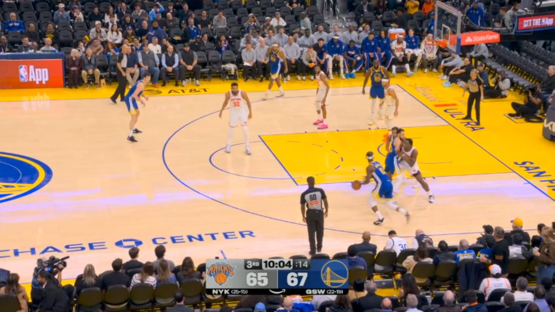 Curiously, they also chose to have OG Anunoby play drop coverage, a decision the Warriors chose to counter by having Butler set the screen higher, near the center logo. With Anunoby in deep drop position, Miles McBride gets chipped by Butler’s screen — enough for Curry to pull up for the three: