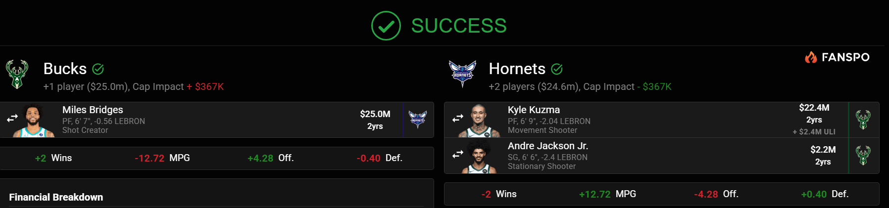 If you’re the Bucks, I think you’d do this deal in a heartbeat. I’ll try my best to make the case for why the Hornets might do it, though. You could argue that, with their new influx of young talent—namely Brandon Miller and Kon Knueppel—Charlotte might be looking to turn over a new leaf and leave the old(er) players from yesteryear behind. It’s also worth noting that they might be looking to move on from Miles, in particular, because of his off-court transgressions (people can Google those themselves if they aren’t aware). Additionally, they’d get to take a flyer on a gifted defender in Jackson, who the Bucks simply don’t have the time to give a real shot. Also, if Charlotte wasn’t interested in AJax, he wouldn’t have to be included; they’d still shave $2.6m off their books just trading for Kuzma (who has the exact same contract length as Bridges).