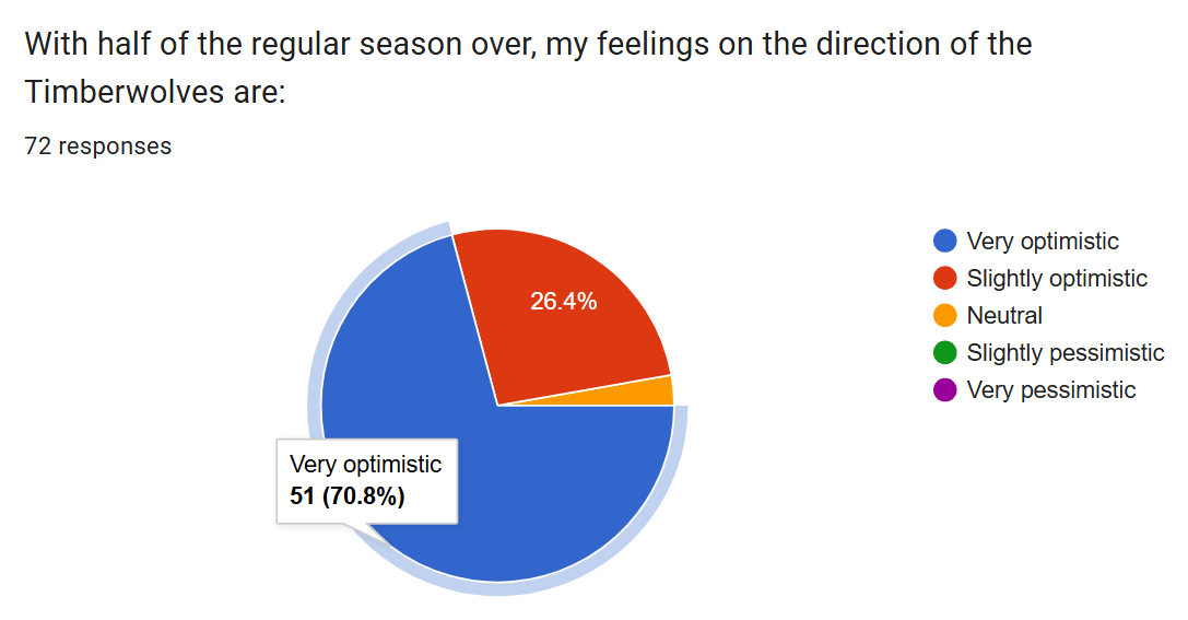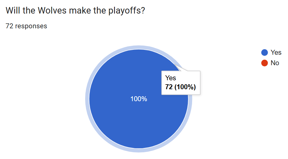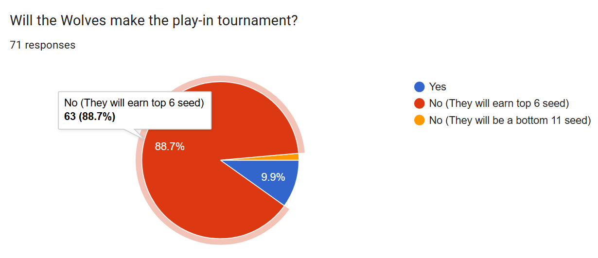 Over 20% of responses were focused on the Western Conference standings. It’s a going to be a photo finish to see how it all shakes it, but ideally, the Wolves can finagle their way into a top three seed, effectively “dodging” the Oklahoma City Thunder until a potential Conference Finals rematch.