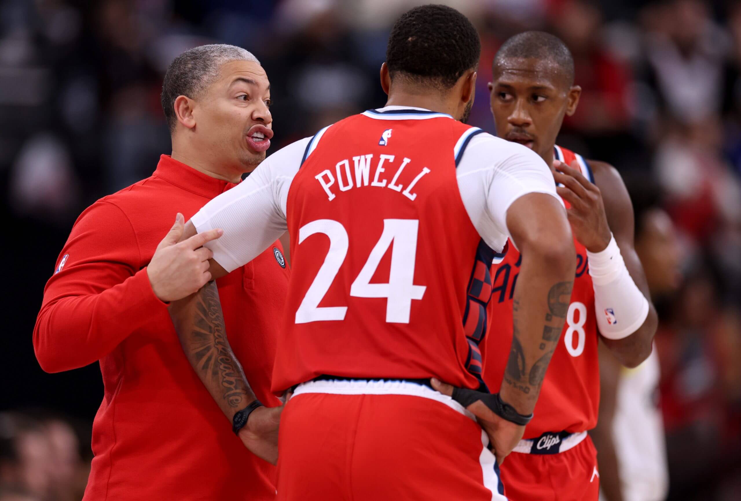 Norman Powell, here with Clippers coach Ty Lue, has become a basketball chameleon, changing his game at various points in his career.  (Harry How / Getty Images)