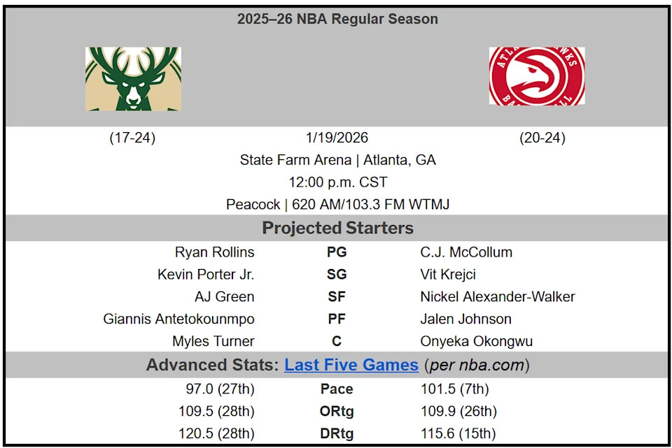 The Milwaukee Bucks will try to forget one of the worst two-game stretches (based on point differential) and end a three-game losing streak against the Atlanta Hawks on the road for Martin Luther King Jr. Day. This is the first time these two Eastern Conference foes have met this season, though the Hawks took the season series 3-2 last year. The last time they played was on March 30, 2025, when the Hawks blew out the Bucks 145-124 in Milwaukee.
