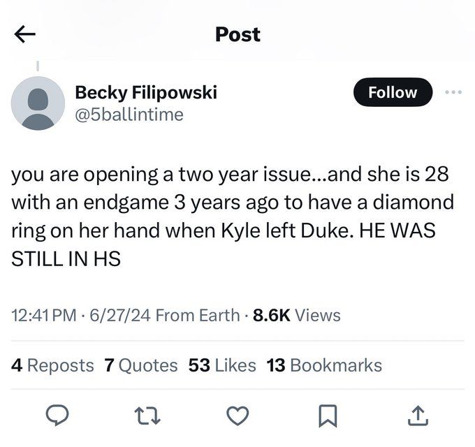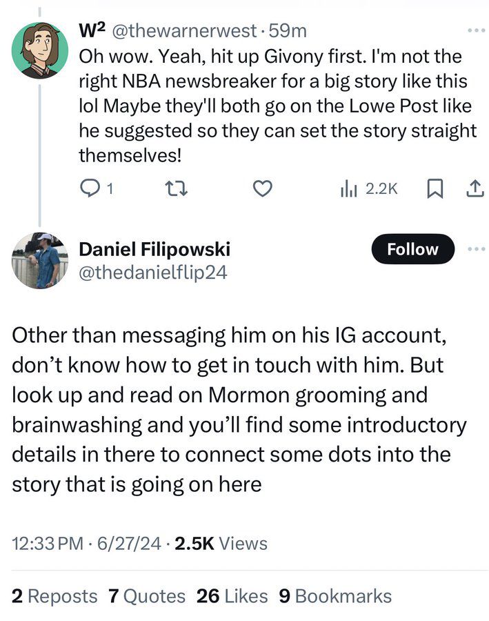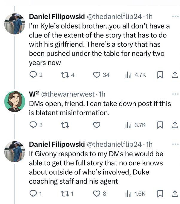 If we combine the accounts of the Filipowski family, they appear to be alleging that Caitlin Hutchinson began a relationship with Filipowski as a high schooler with the intent of grooming him and converting him to the mormon religion. According to their allegations, that includes a long-term play to become engaged to him shortly after he left Duke, and with the NBA on the horizon. This appears to have caused friction between Filipowski and his family, with Kyle seemingly choosing his relationship with Caitlin over his family, and — again, according to their tweets and Givony’s accounting of what NBA executives are saying — severing a relationship with them.
