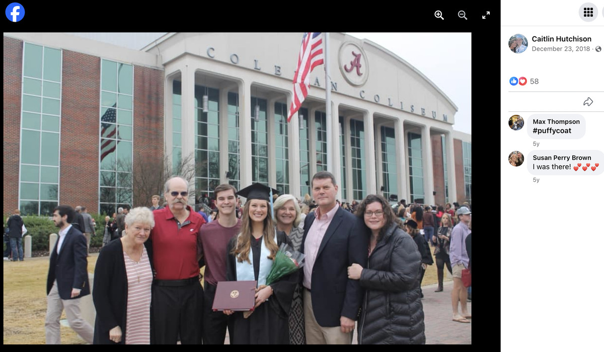 Trying to ascertain Hutchinson’s age is critical here, and that will become very apparent in a moment. A Facebook post from December 23, 2018 shows Hutchinson graduating from Alabama.