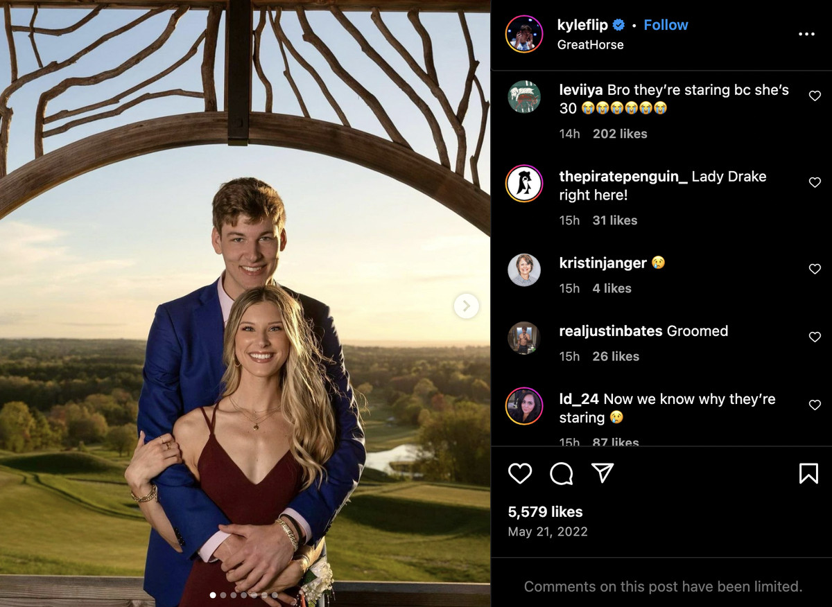 Filipowski was born in November of 2003. At the time of this photo he was 17 years old, and Hutchinson was (probably) 25 or 26. Even if we assume the first time they met was at this prom, that’s still an adult dating a minor. However, a now-deleted comment on the Filipowski prom photo from Hutchinson read: “one year with my favorite person.”