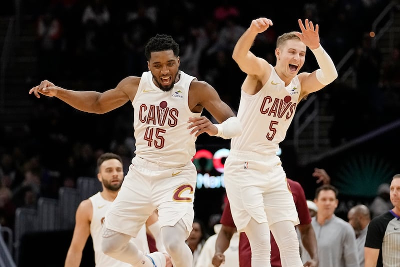Cleveland Cavaliers guards Donovan Mitchell (45) and Sam Merrill (5) celebrate after a 3-point basket by Merrill in overtime against the Houston Rockets, Monday, Dec. 18, 2023, in Cleveland. | Sue Ogrocki, Associated Press