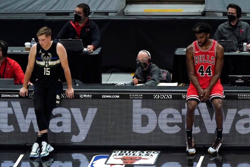 Milwaukee Bucks guard Sam Merrill, left, and Chicago Bulls forward Patrick Williams wait to check into a game at the scorer’s table during game in Chicago, Sunday, May 16, 2021. | Credit: Nam Y. Huh, Associated Press