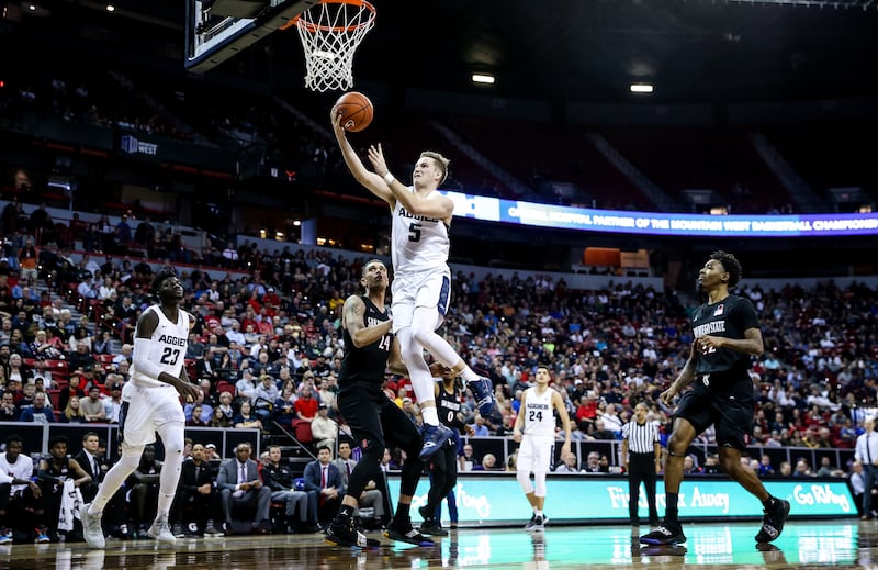 Utah State guard Sam Merrill goes to the hoop during the Mountain West Conference finals against the San Diego State Aztecs at the Thomas & Mack Center in Las Vegas on Saturday, March 16, 2019. | Spenser Heaps, Deseret News