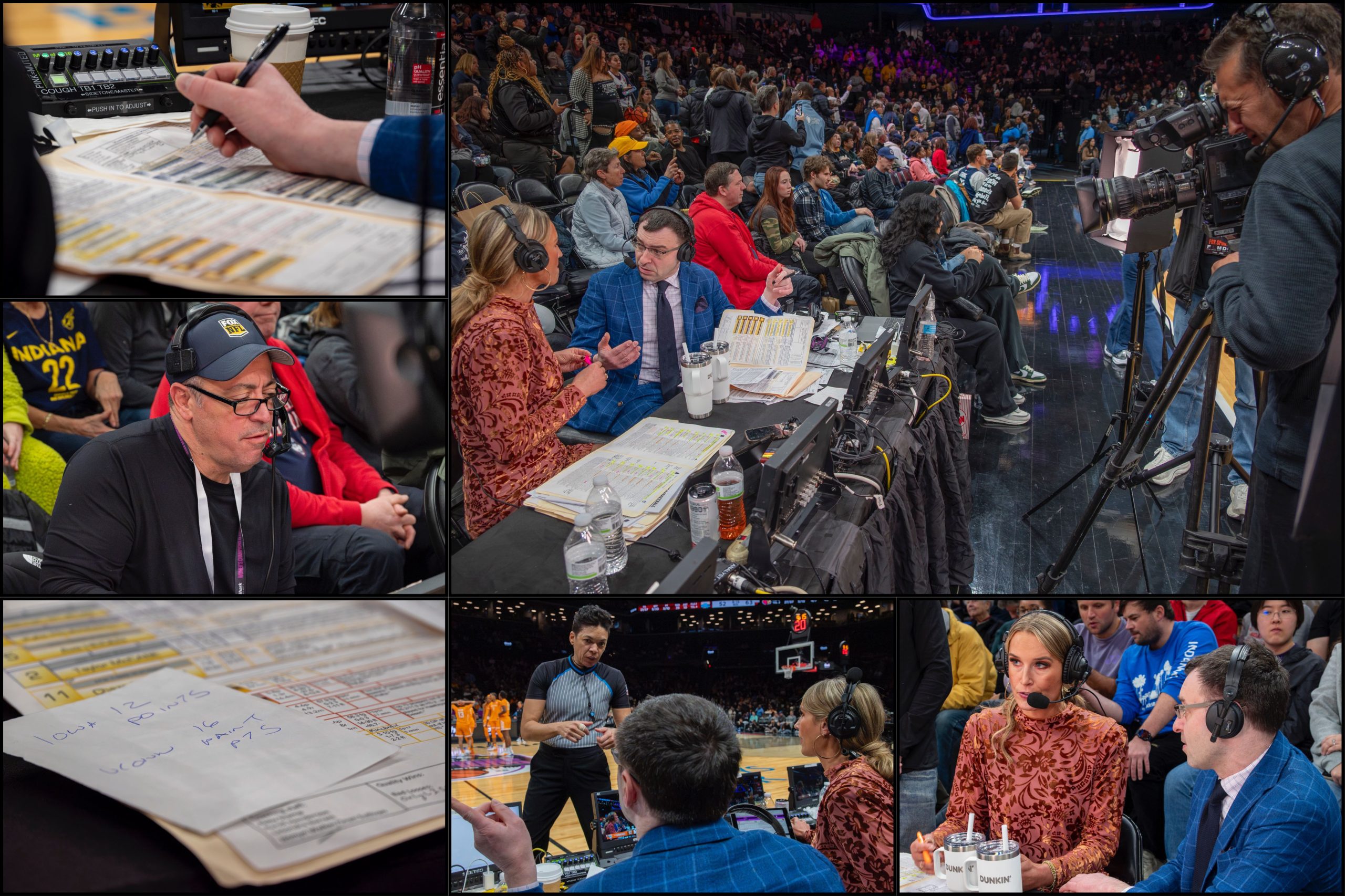 Ahead of the on-air presentation, Benetti and Kustok rehearse their open at the broadcast table and communicate with producers. While there is an producer and other staff on-site, the majority of the production operates remotely from Los Angeles. As the broadcasters review their notes and other storylines, the players warm up on the court.