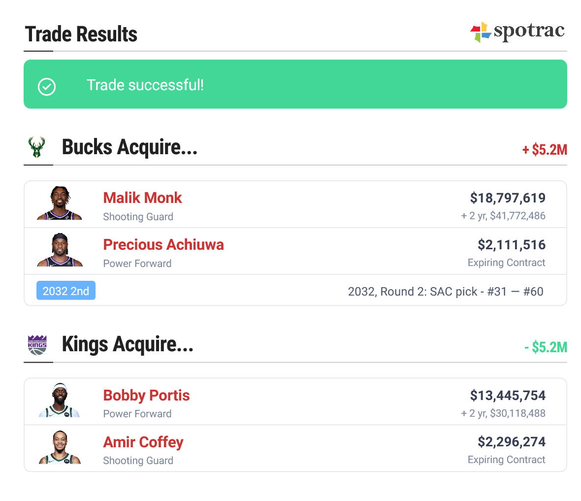 Regardless, if that is genuinely the Kings’ asking price, the Bucks shouldn’t pay it, not with a re-swap of their 2026 first-round pick, nor their 2031 or 2032 first-round selections. In the deal, the Bucks ship out Bobby Portis and Amir Coffey for Monk, backup big man Precious Achiuwa, and the Kings’ 2032 unprotected second-round pick. As with the Zach LaVine trade I suggested a couple of weeks ago, this trade couldn’t be completed until deadline day, since Achiuwa was signed on November 4 and can’t be traded for 90 days.