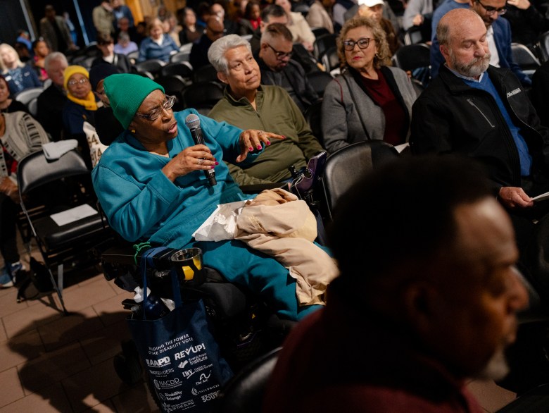Willie Mae Clay, a community member, voices concerns about accessibility on future projects at the Frost Bank Center during a town hall meeting on Saturday morning. Credit: Brenda Bazán / San Antonio Report