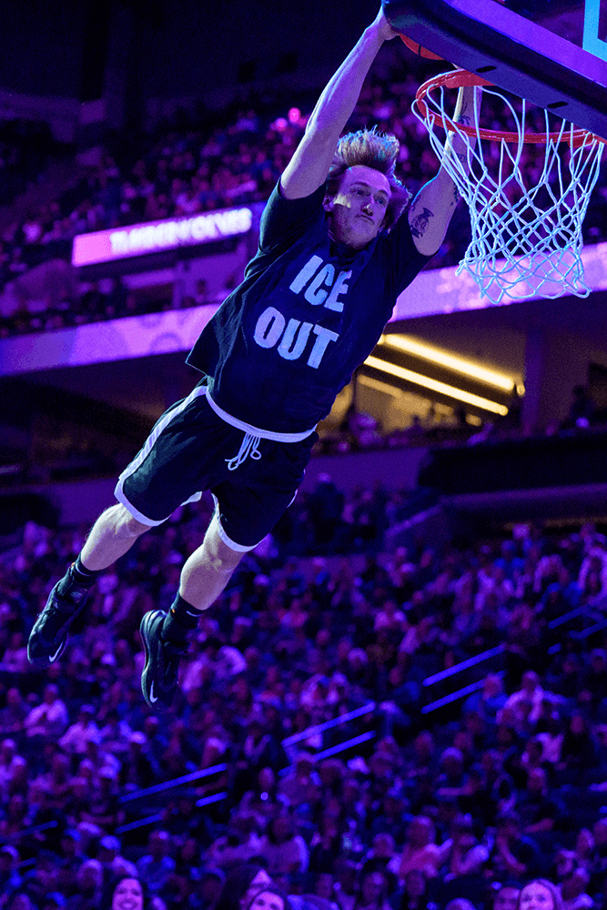 The timeout entertainment wore ‘ICE OUT’ shirts while performing in the third quarter of the game between the Minnesota Timberwolves and Golden State Warriors at Target Center on Jan. 25, 2026 in Minneapolis. Matt Blewett/Imagn Images via Reuters