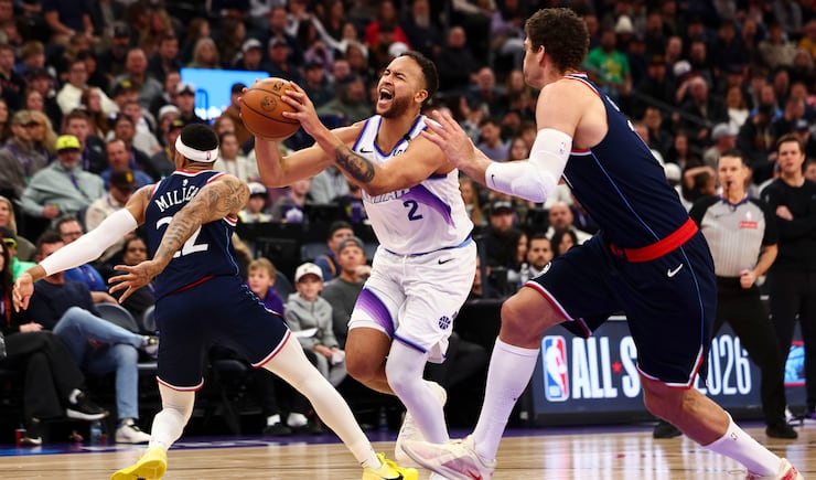 Utah Jazz forward Kyle Anderson (2) is fouled by LA Clippers guard Jordan Miller (22) while drives to the basket during the second half of an NBA game at the Delta Center in Salt Lake City on Tuesday, Jan. 27, 2026. | Rio Giancarlo, Deseret News
