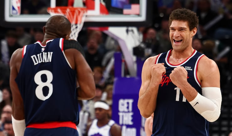 LA Clippers center Brook Lopez (11) celebrates a three-pointer by guard Kris Dunn (8) during the second half of an NBA game against the Utah Jazz at the Delta Center in Salt Lake City on Tuesday, Jan. 27, 2026. | Rio Giancarlo, Deseret News