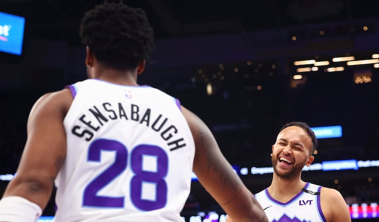 Utah Jazz forward Kyle Anderson (2) smiles as he high fives forward Brice Sensabaugh (28) during the second half of an NBA game against the LA Clippersat the Delta Center in Salt Lake City on Tuesday, Jan. 27, 2026. | Rio Giancarlo, Deseret News