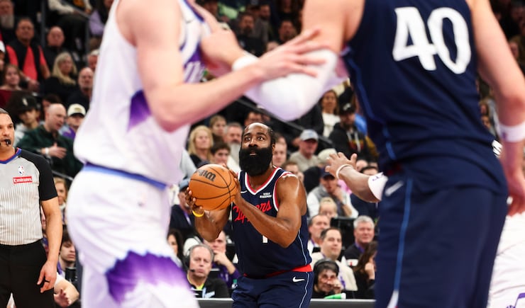 LA Clippers guard James Harden (1) shoots a 3-pointer during the first half of an NBA game against the LA Clippers at the Delta Center in Salt Lake City on Tuesday, Jan. 27, 2026. | Rio Giancarlo, Deseret News