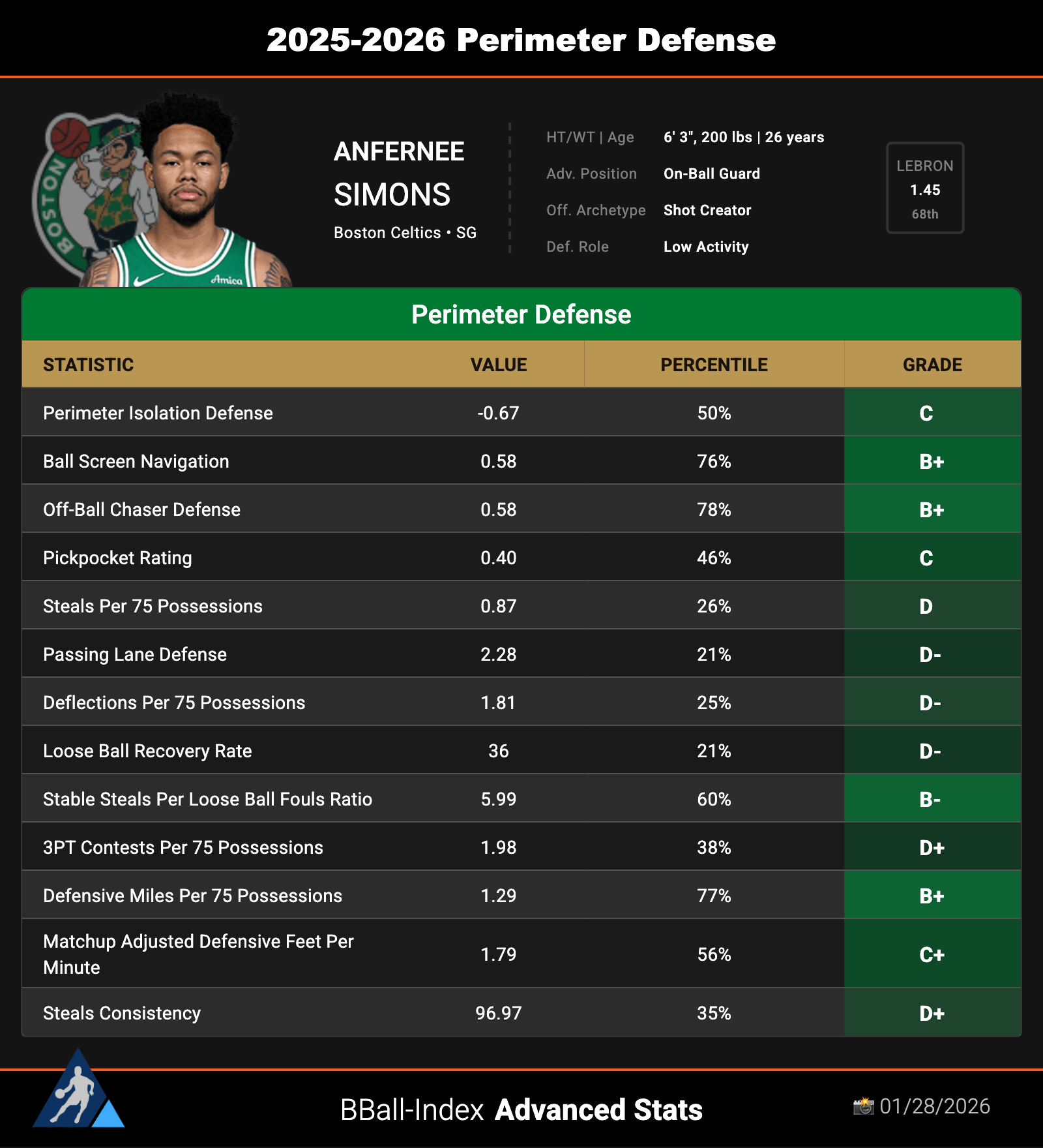 Here is how he graded out as a perimeter defender last season per Bball-Index.