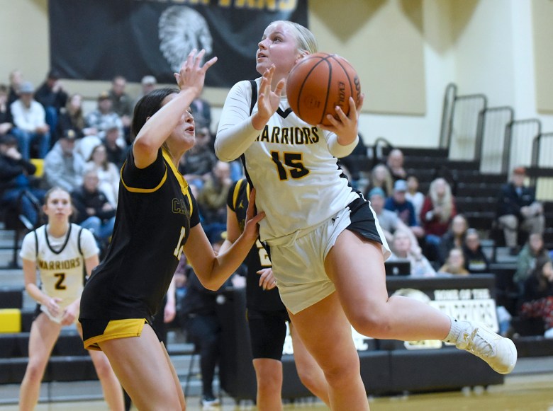 Philomath junior Annaleise Brown gets through the Cougars defense for a layup attempt. (Photo by Andy Cripe/Philomath New