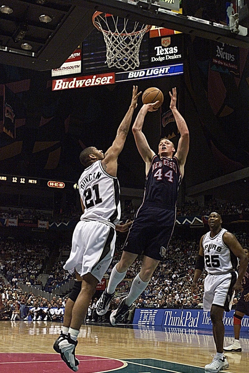New Jersey Nets’ Keith Van Horn shoots over San Antonio Spurs’ Tim Duncan, left, during game March 6, 2000, at the Alamodome in San Antonio. | ASSOCIATED PRESS