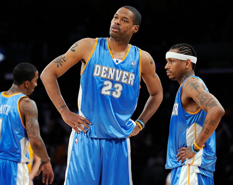 Denver Nuggets center Marcus Camby (23) and Allen Iverson (3) are seen during Game 2 of an NBA basketball first-round playoff series against Los Angeles Lakers at the Staples Center in Los Angeles, Wednesday April 23, 2008. | ASSOCIATED PRESS