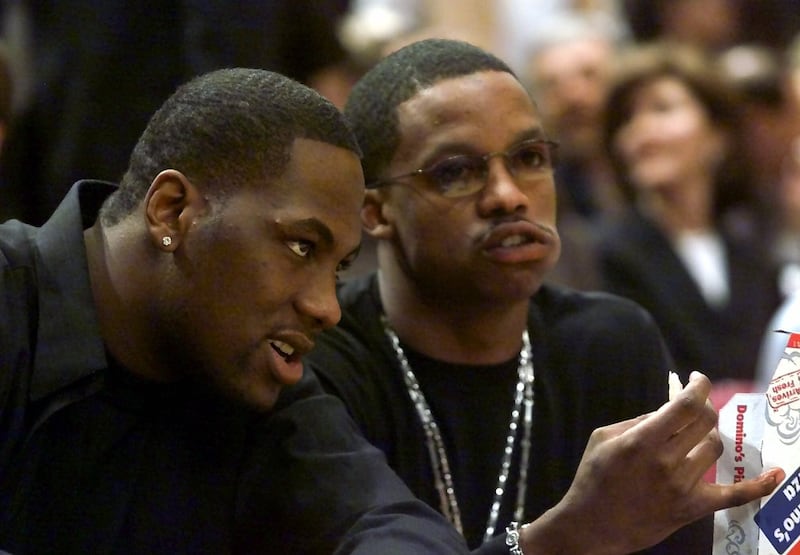 Chicago Bulls’ Elton Brand, left, and Houston Rockets’ Steve Francis watch the New York Knicks and the Miami Heat in Game 3 of the NBA Eastern Conference semifinals Friday, May 12, 2000, in New York. Brand and Francis shared the rookie of the year honors for the NBA in 2000. | ASSOCIATED PRESS