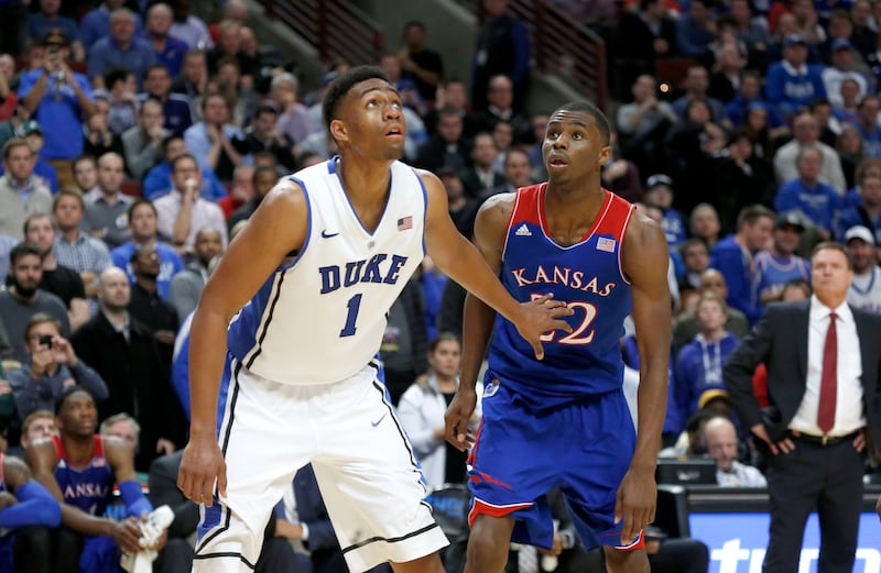 tad and Kansas guard Andrew Wiggins look for a possible rebound off a free-throw attempt during game Tuesday, Nov. 12, 2013, in Chicago. | AP