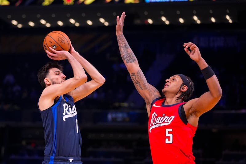 Chet Holmgren, left, of the Oklahoma City Thunder shoots over Paolo Banchero of the Orlando Magic during an NBA Rising Stars game in Indianapolis, Friday, Feb. 16, 2024. | AP